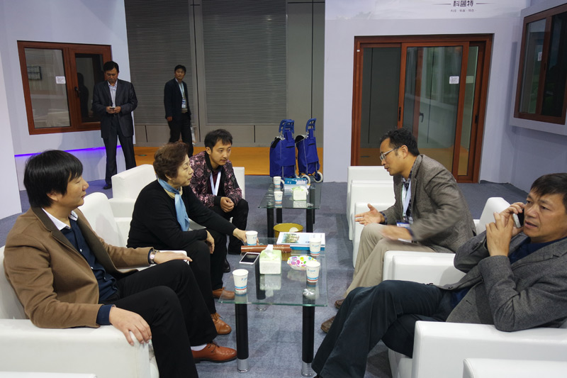 协会参观人员在坚朗五金制品股份有限公司展厅前合影 协会参观人员与安徽科蓝特铝业有限公司董事长雷忠平在展厅进行交流