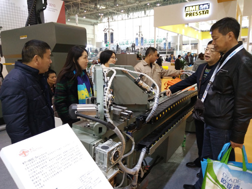 金工铝门窗机械实业有限公司领导讲解设备性能;