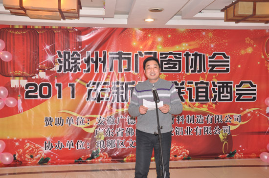 首先,市门窗协会会长、滁州鸿兴达瑞节能建材科技有限公司董事长张勇向与会者致辞,代表市门窗协会向各位领导、嘉宾在过去一年中对协会的支持表示衷心的感谢,向一贯关注、支持协会工作的建筑行业的各位同仁和社会各界朋友表示衷心的感谢。并表示市门窗协会在新的一年中继续围绕行业发展创新工作,积极引导会员抓住机遇,寻求企业新的增长点,加快滁州市门窗行业的提升。随后市工商联张吉明副主席讲了话,祝贺市门窗协会和会员企业在2010年中取得了较大的发展,感谢在座各有关部门领导对市门窗协会工作的大力支持,使协会发展走向成熟,希望市门窗协会在市委、市政府领导和各有关部门支持下,进一步为企业服务,加强行业自律,以法开展协会工作,要在自主创新上迈进一步,促进滁州经济发展。