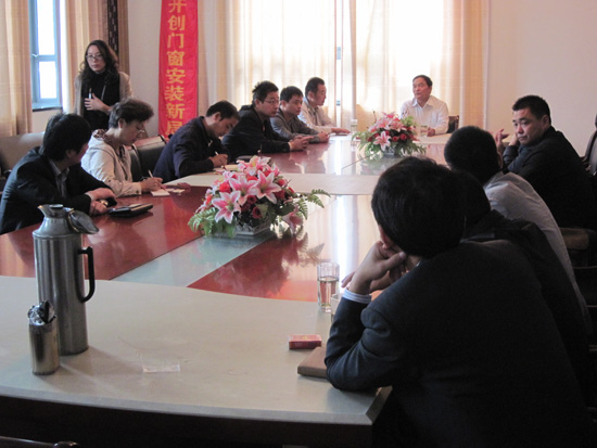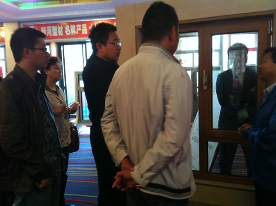宏夏门窗公司董事长裴效生向协会参观人员介绍企业及节能门窗副框产品研发和推广情况