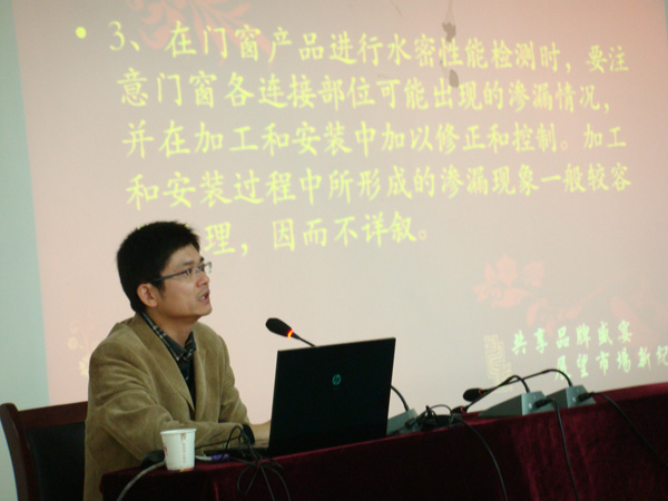 为了提高培训效果,培训班采取了讲课与提问相结合和讲课与生产现场指导相结合的互动形式。罗普斯金铝业技术研发部蔡强经理根据协会提交的铝合金门窗生产安装中存在的问题,先着重讲解了铝合金门窗雨水渗漏原因分析及解决办法、铝合金门窗组角工艺与胶的关系、外平开窗与滑撑的关系等问题,每当蔡老师讲到比较突出的关键性问题时,要求学员们提出各自意见,交流解决问题的方法,加深对问题的理解。蔡老师还通报了我国铝门窗未来发展趋势:主要以低碳环保为前提的发展方向,成品门窗将标准化、系统化、智能化、人性化,产品开发和技术创新将成为门窗企业的核心竞争力,门窗企业将形成以大企业为主导,中小企业为辅助的市场结构。接着培训人员到金鹏铝合金门窗生产车间,根据现场生产情况蔡强老师分别强调了铝门窗制作工艺、技术要求和注意事项,又针对大家提出的问题一一作了讲解,使培训人员真真切切学到了技术,也加强了门窗型材生产厂家和门窗生产企业相互沟通,促进了今后更好的合作和产品质量的提高。