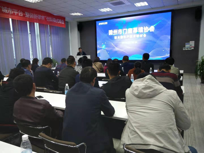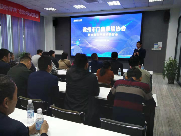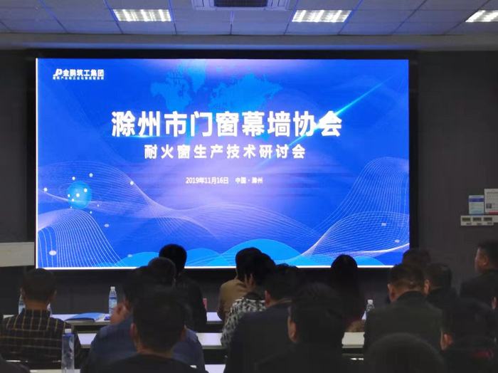 滁州市门窗幕墙协会举办耐火窗生产技术交流研讨会 11月16日,滁州市门窗幕墙协会在金鹏节能科技有限公司多媒体会议室举办了耐火窗生产技术交流研讨会,会员企业负责人、技术负责人和技术骨干60多人参加了研讨会。 协会秘书处