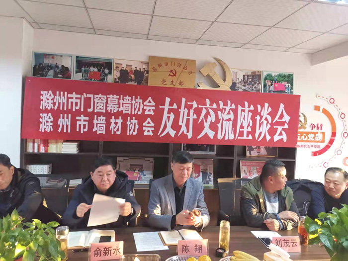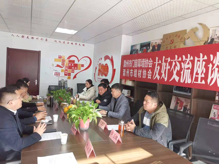 | 滁州市门窗幕墙协会与滁州市墙体革新和建筑材料节能协会友好交流座谈会 为加强行业协会之间的交流合作,11月23日下午,滁州市门窗幕墙协会与滁州市墙体材料革新和建筑材料节能协会在滁州市门窗幕墙协会小会议室召开了友好座谈会。市门窗幕墙协会张勇会长和市墙材协会陈翔会长以及两会的副会长和秘书处参加了此次座谈会。