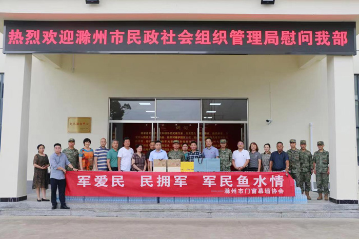 | 军爱民 民拥军 军民鱼水情 —滁州市门窗幕墙协会“八一”建军节慰问驻滁部队 为庆祝中国人民解放军建军95 周年,进一步支持国防建设,促进双拥工作的开展。2022 年7 月26 日滁州市民政组织管理局局长董如宝带领滁州市门窗幕墙协会、滁州市小微企业商会等社会组织到驻滁部队(合成旅二三五旅)进行了慰问,送去慰问品和节日的问候。