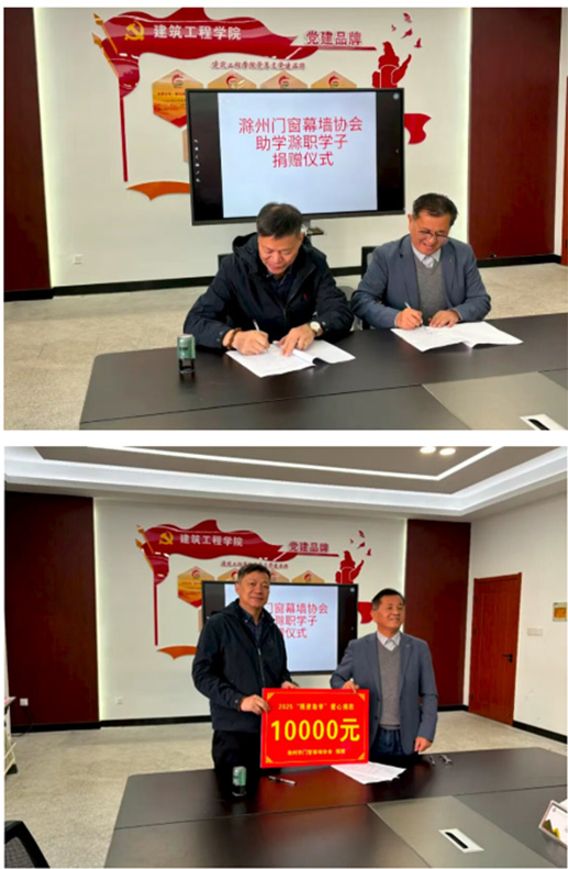 滁州市门窗幕墙协会党支部书记陈翔代表协会发表讲话。他表示,协会在发展自身的同时,始终不忘回馈社会,捐资助学传统已延续十余年。滁州职业技术学院是高素质技能人才培养基地,建筑工程学院所设专业更与门窗幕墙行业息息相关;此次捐助承载的是协会全体会员单位对同学们的深切关怀和殷切期望。 当前国家正大力推动传统制造业产业升级,门窗幕墙行业也正朝着绿色化、智能化方向快速发展,期待未来能有更多的优秀专业人才进入行业,共同为滁州的城市建设添砖加瓦,为行业的高质量发展贡献智慧与力量。 辅导员代表及学生处领导向与会人员介绍了贫困学生的基本情况,并表示,协会的爱心善举为学生们上了一堂生动的感恩教育课。学院将妥善利用这笔助学金,精准资助品学兼优的贫困学生,并教导学生们将这份爱心转化为奋发学习、回报社会的强大动力。 在全体与会人员的共同见证下,捐赠协议签字仪式正式举行。协会党支部书记陈翔与建筑工程学院院长朱永祥共同在协议上签字,标志着协会对学子们的关爱正式落地,也为校企之间的深厚情谊写下新注脚。